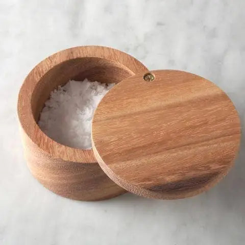 Handcrafted from gorgeous acacia wood, this is a perfect storage container for salt and spices with a swinging lid. You can also use it to hold small items (such as reusable cotton rounds).